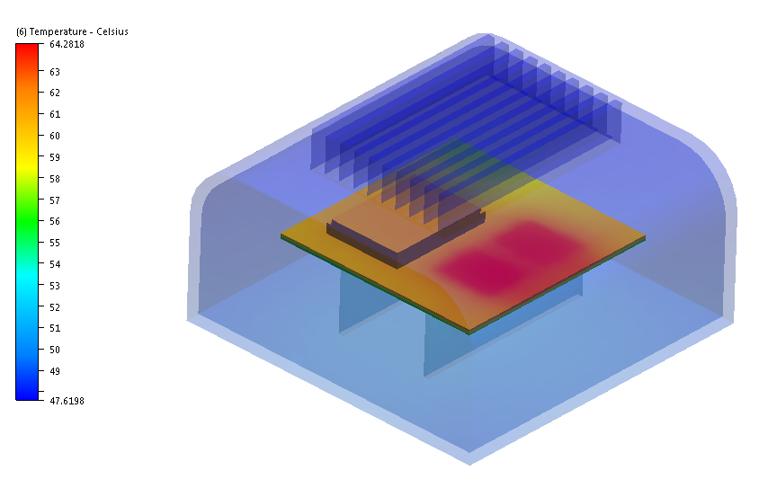 An application of this interoperability is to compute the thermal stress in components within an electronic enclosure. Using Autodesk CFD, we assign thermal dissipations to several components and simulate the air flow and heat transfer. The result is a temperature distribution on every component in the model.