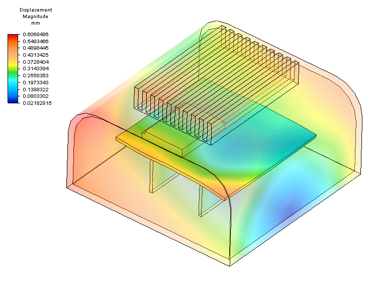We load the same CAD model into Simulation Mechanical, assign materials and constraints as needed, and select the CFD design study file. When we start the analysis, Simulation Mechanical uses the temperature results as loads, and computes the thermally-induced stress on the components. The result is a view into the system performance that includes the flow and thermal behavior within the enclosure as well as the structural behavior of each component.