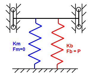 Consider a beam (represented by red spring K b ) that is stretch to create a preload of amount P, and then attached to the members (represented by blue spring K m ). The beam and member then compress an amount Δ. Since the beam is stretched before attaching to and compressing the member, the final load F' in the beam equals the preload minus the stiffness times the compression, while the equal (but opposite) load in the member equals the stiffness times the compression. Thus, there are two equations and two unknowns (F' and Δ).