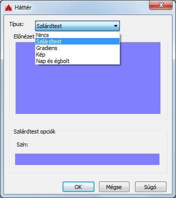 Felsorolja a nézetre alkalmazható háttér-felülírásokat (Nincs, Szilárdtest, Gradiens, Kép, Nap és égbolt).