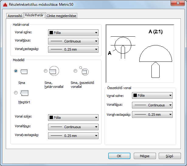 Beállítja a részlethatárvonal, a modellél és a részletnézetek összekötő vonalainak tulajdonságait