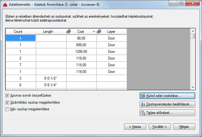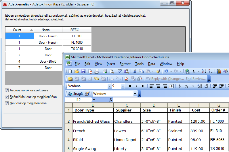 Az Excel számolótáblákban tárolt adatok összekapcsolhatók és egyesíthetők a kiemelt rajzadatokkal (objektumtulajdonság-adatokkal). A fenti példát folytatva tegyük fel, hogy a rajzban szereplő ajtókhoz további adatok (szállító és költség) állnak rendelkezésre egy Excel számolótáblában. Kiválasztja a számolótábla Szállító és Költség oszlopát, és egyesíti az adatkiemelés egyéb adataival.