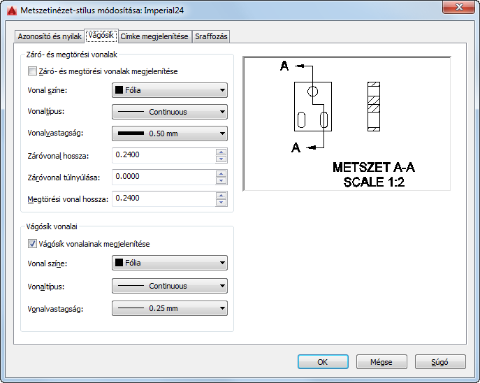 Beállítja a metszetvonalak által használt záró- és hajlítási vonalak, valamint a síkvonalszakaszok tulajdonságait.