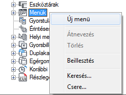 A Testreszabás lap <fájlnév> testreszabási beállításai ablaktábláján kattintson a jobb gombbal a Menük csomópontra. Kattintson az Új menü menüpontra.