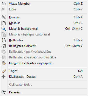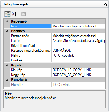 Egy hullámvonal (~), felkiáltójel és egy azt követő pont (!.) karakterek a Másolás vágólapra csatolással parancs címkéje elé kerülnek a Tulajdonságok ablaktábla Név tulajdonságában. Alább látható a Szerkesztés menüben megjelölt és kiszürkített Másolás vágólapra csatolással parancs eredménye.