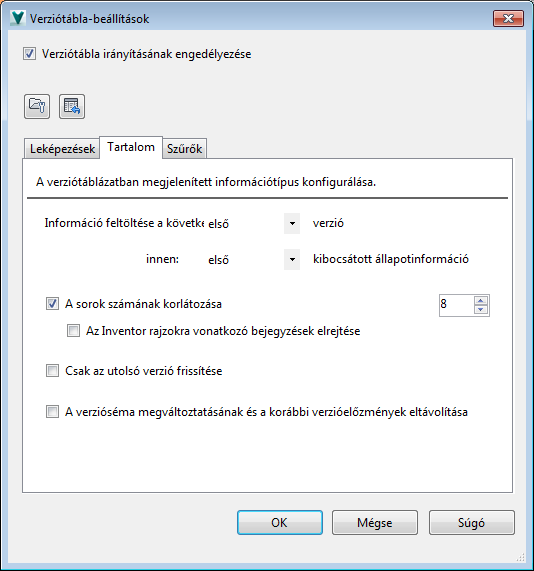 A Tartalom lapon állíthatja be, hogy milyen típusú információ jelenjen meg a verziótáblázatban. ![]() |
