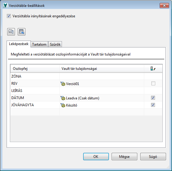 A Leképezések lapon a Vault tár tulajdonságait hozzárendelheti a Verziótáblázat oszlopaihoz. ![]() |