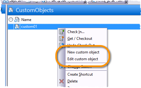 A mymenu.mnu fájl menüdefiníciói a fájlbeli résztől függően egy CreateCustomObject.ps1 vagy EditCustomObject.ps1 nevű PowerShell fájlra mutatnak. Az egyéni objektumok létrehozására és szerkesztésére szolgáló parancsfájl hasonló a más objektumok, például fájlok és mappák létrehozására és szerkesztésére szolgáló parancsfájlokhoz. Ugyanakkor az egyéni objektumok létrehozására és szerkesztésére szolgáló parancsfájl két egyedi parancsot tartalmaz, ezek: GetCreateCustomObjectDialog és GetEditCustomObjectDialog.