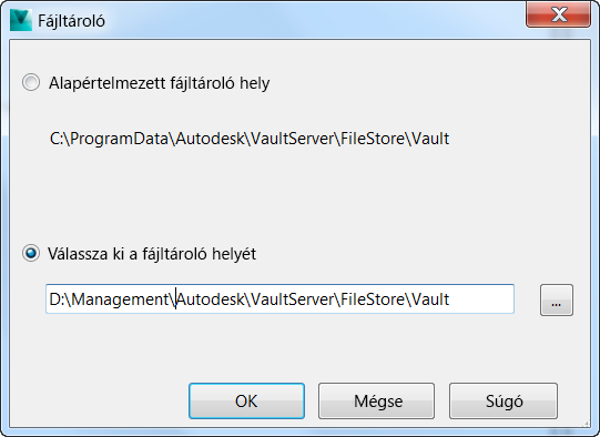 A Fájltároló párbeszédpanelen engedélyezheti egy vagy több Vault fiók számára az Autodesk Data Management Server helyett a File Server használatát a fájltároló frissítéséhez.