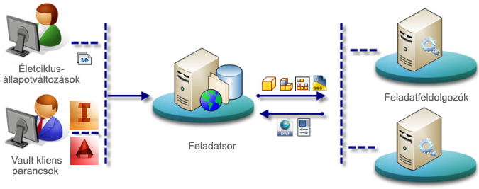 - Job Processor – egy különálló alkalmazás, amely lefoglalja a sorban álló munkákat és lehúzza azokat a feladatszerverről feldolgozásra. Mivel a Job Processor a Vault klienssel települ, bármely Autodesk Vault Workgroup és Professional alkalmazást tartalmazó munkaállomás használható a feladatok közzétételére.