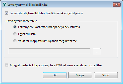 A Látványtervmelléklet beállításai párbeszédpanelen engedélyezheti vagy letilthatja a fájlmellékleteket, megadhatja, hogy hol kerüljenek közzétételre a látványtervmellékletek és letilthatja vagy engedélyezheti a DWF-figyelmeztetéseket.