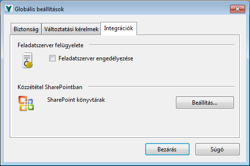 A Globális beállítások párbeszédpanel Integrációk lapján engedélyezheti a Job Server alkalmazást, és megadhatja a SharePoint könyvtárakba történő közzététel beállításait.