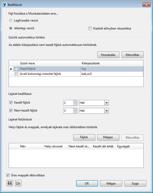 Megadhatja, hogy mely, a Vault által automatikusan nem kezelt fájltípusok törlődjenek a munkaterületről. A munkamappában található bármely fájl, ami megfelel a megadott kiterjesztéseknek törlődik a szinkronizálás során. Alapértelmezés szerint két szűrő van kikapcsolva: Naplófájlok (.log) és az ACAD biztonsági másolat fájlok (.bak, ac$).