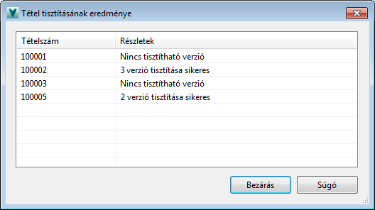 A Vault Client alkalmazással végzett Tételek tisztítása műveletet követően megjelenik a Tétel tisztításának eredménye párbeszédpanel. A párbeszédpanelben láthatók a tisztításra kiválasztott tételekhez tartozó tételszámok, valamint a verziók száma, melyet a program az egyes tételek esetén eltávolított.