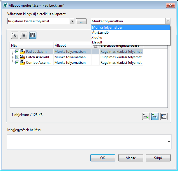 Az Állapot módosítása parancs lehetővé teszi, hogy a felhasználó módosítsa fájlok, mappák, tételek és egyéni objektumok életciklus-állapotát. Egy Vault objektum életciklus-állapotának módosítása bizonyos viselkedéseket vált ki, melyeket a Vault rendszergazdája tud beállítani. Állapotok lehetnek például: Munka folyamatban, Kiadva vagy Elavult.