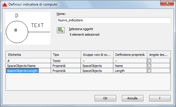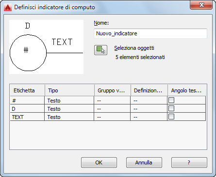 Per creare un indicatore di computo che includa e visualizzi i dati del gruppo voci di computo relativi ad un determinato oggetto nel disegno, attenersi alla procedura indicata di seguito.