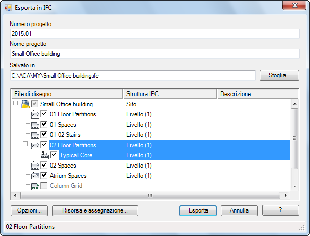 Se i disegni sono stati assegnati ai livelli come parte del progetto di AutoCAD Architecture, nella struttura IFC viene visualizzata per default l'etichetta corrispondente. Altrimenti, saranno associati per default al Livello 1.
