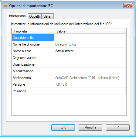 Il nome del disegno attivo sullo schermo viene visualizzato nella scheda Intestazione della finestra di dialogo Opzioni di esportazione IFC. È possibile aggiungere informazioni sul file di disegno da esportare, come la descrizione del disegno, l'autore e il nome della società, i dati di autorizzazione e la posizione geografica dell'edificio. Ad esempio, nella scheda Intestazione, come descrizione di un disegno strutturale, è possibile immettere Struttura per edificio commerciale 152. Quando il file viene visualizzato, questa informazione è visibile nell'intestazione del file IFC.