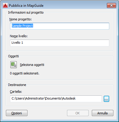 Se il disegno contenente gli oggetti da pubblicare fa parte di un progetto di costruzione, il nome del progetto e l'assegnazione del livello del disegno vengono visualizzati nella finestra di dialogo Pubblica in MapGuide.