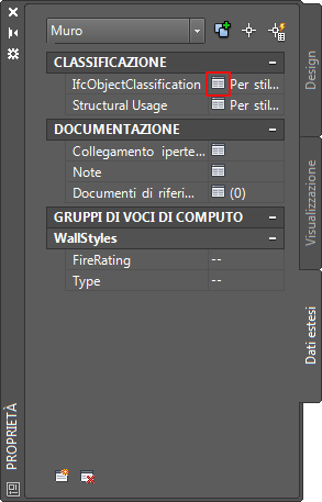 - Nella tavolozza Proprietà, scheda Dati estesi, gruppo Classificazione, fare clic su ifcObjectClassification e selezionare la classificazione.