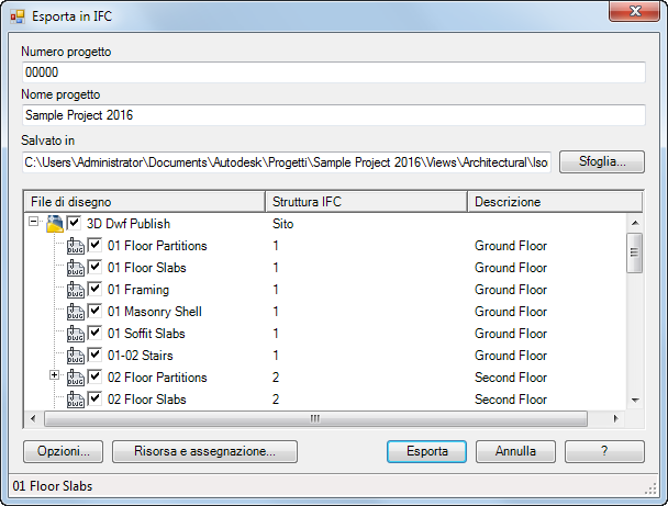Per definire quali riferimenti esterni del file di progetto verranno esportati e la relativa modalità di visualizzazione nel file IFC, è sufficiente accettare le assegnazioni di livello di default o specificare un'etichetta diversa. Tutti i disegni che vengono assegnati alla stessa struttura IFC vengono esportati in IfcBuildingStorey all'interno del file IFC.