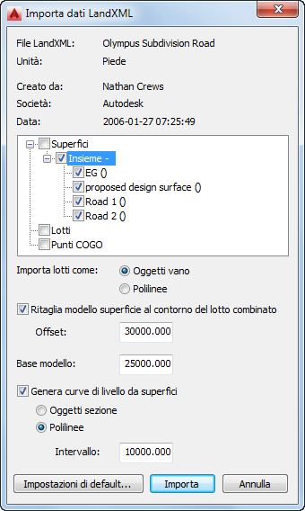 3. Nella finestra di dialogo Importa dati LandXML, selezionare le opzioni di importazione.