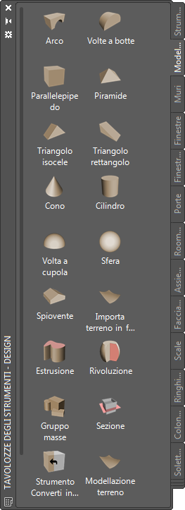 Le tavolozze personalizzate create dall'amministratore CAD o da altri utenti possono anche contenere strumenti Massa con stili e proprietà personalizzati per i propri progetti o standard aziendali.