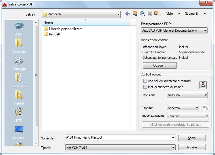 Nella finestra di dialogo Salva con nome, specificare le informazioni per il file PDF come desiderato.