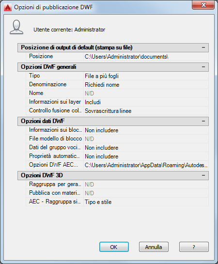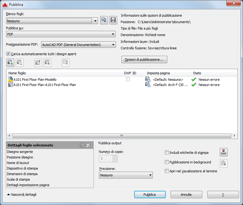 È possibile impostare la pubblicazione automatica dei disegni in formato PDF, DWF o DWFx al momento del salvataggio o della chiusura. Le impostazioni di pubblicazione automatica consentono inoltre di specificare se includere modelli, layout o entrambi e se pubblicare un file a più fogli o ad un solo foglio.