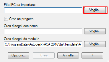 - Nella finestra di dialogo Importa file IFC e crea disegni, in File IFC da importare, fare clic su Sfoglia.