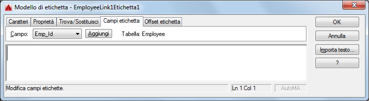 Aggiunge all'etichetta il campo selezionato dall'elenco Campo.