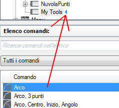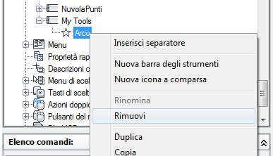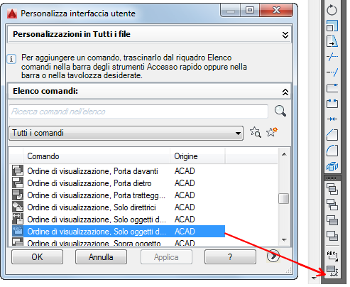- Nel riquadro Elenco comandi, trascinare il comando da aggiungere alla barra degli strumenti nel riquadro Personalizzazioni in <nome file>.