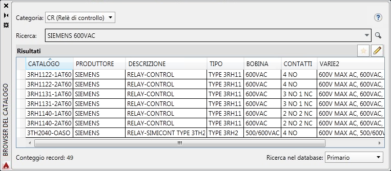 Ad esempio, quando si fa clic su Cerca per una bobina di commutazione senza un valore di catalogo, si desidera che il Browser del catalogo cerchi i numeri di parte Siemens per i relè a "600VAC". Modificare il file del database di catalogo, quindi selezionare la tabella _LISTBOX_DEF. Inserire un record con questi valori nei campo: