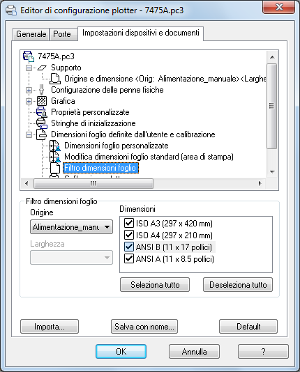 Regola l'area di stampa di modo che le dimensioni standard del foglio siano supportate dalle funzioni della stampante. Per le stampanti di sistema per Windows non è possibile creare dimensioni del foglio personalizzate utilizzando l'Editor di configurazione plotter.