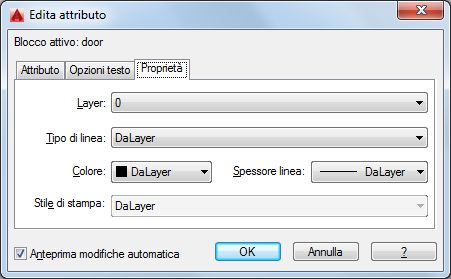 Definisce il layer dell'attributo, nonché il colore, lo spessore e il tipo di linea. Se nel disegno vengono utilizzati stili di stampa, è possibile assegnarne uno all'attributo nella scheda Proprietà.