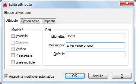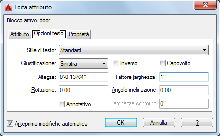 Verifica che l'area del disegno sia aggiornata immediatamente per visualizzare tutte le modifiche apportate agli attributi visibili. Se l'opzione Anteprima modifiche automatica viene selezionata, le modifiche saranno immediatamente visibili. Se l'opzione Anteprima modifiche automatica viene deselezionata, le modifiche non saranno immediatamente visibili.