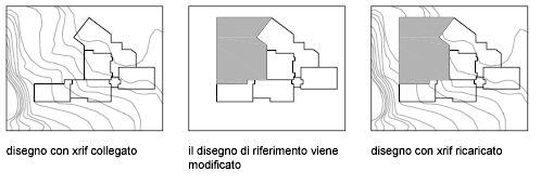 Quando si apre un disegno, tutti i riferimenti dei disegni (xrif) si aggiornano automaticamente. È possibile aggiornare gli xrif ogni volta che si desidera che nel disegno vengano visualizzate le versioni più correnti.