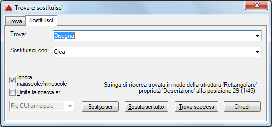 Nota: Non è possibile annullare la sostituzione di un valore di stringa. Se si commette un errore, chiudere la finestra di dialogo Trova e sostituisci e uscire dall'editor Personalizza interfaccia utente (IUPERS), quindi riprovare.