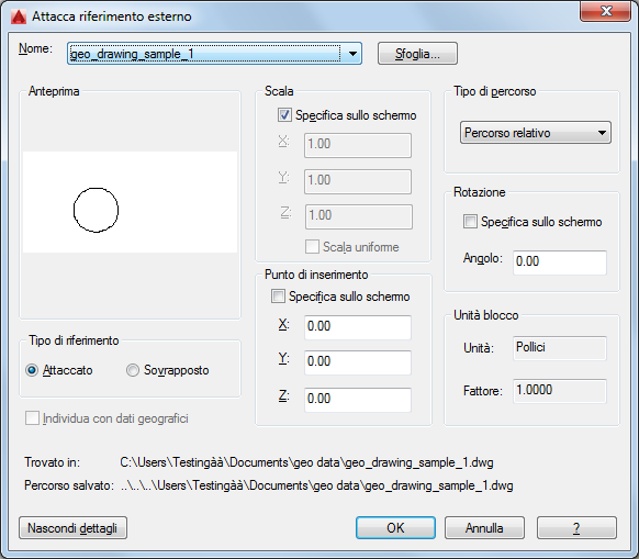 Selezionare il percorso completo (assoluto), il percorso relativo al file del riferimento esterno, nessun percorso o il nome del riferimento esterno (il file deve essere posizionato nella stessa cartella del file di disegno corrente).