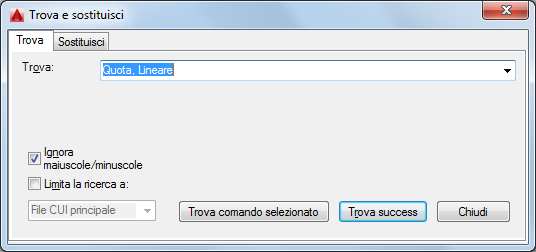 Individua una stringa di ricerca nei comandi o nelle proprietà dei comandi disponibili nei riquadri Elenco comandi o Personalizzazioni in <nome file>, o sostituisce una stringa di ricerca con una nuova stringa.