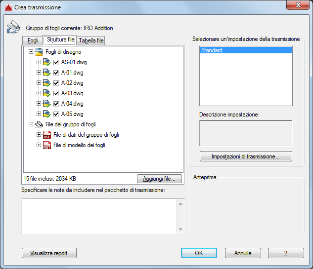 Visualizza le informazioni di rapporto inserite nel pacchetto di trasmissione. Comprende tutte le note di trasmissione inserite nella scheda Generale e le note di distribuzione generate automaticamente che spiegano in dettaglio quali passi devono essere portati a termine affinché il pacchetto di trasmissione funzioni correttamente. Ad esempio, se vengono rilevati font SHX in uno dei disegni in trasmissione, vengono fornite istruzioni sulla posizione in cui copiare questi file in modo che vengano rilevati nel sistema in cui viene installato il pacchetto di trasmissione. Se è stato creato un file di testo contenente note di default, nel rapporto vengono incluse anche queste note.