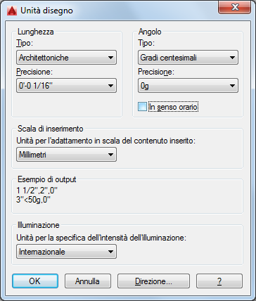 che include Architettonico, Decimale, Ingegneristico, Frazionario e Scientifico. I formati Ingegneristico e Architettonico producono visualizzazioni in piedi e pollici e presuppongono che ogni unità di disegno equivalga ad un pollice. Gli altri formati possono rappresentare qualsiasi unità di misura reale.
