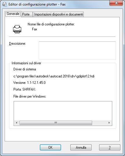 - Tipo di driver del plotter (di sistema o non di sistema), nome, modello e posizione.