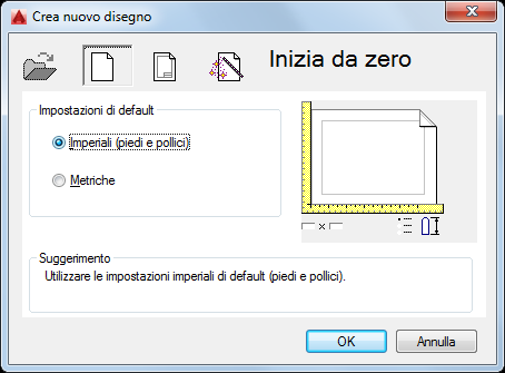 Inizia un disegno vuoto utilizzando le impostazioni imperiali o metriche di default (variabile di sistema MEASUREINIT). È possibile cambiare il sistema di misurazione di uno specifico disegno utilizzando la variabile di sistema MEASUREMENT. Il file Disegno1.dwg aperto all'avvio del programma è costituito da un disegno da zero.