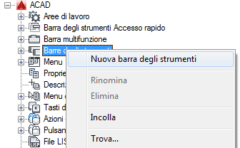 - Trascinare il menu da cui si desidera creare una barra degli strumenti e rilasciarlo sul nodo Barre degli strumenti.