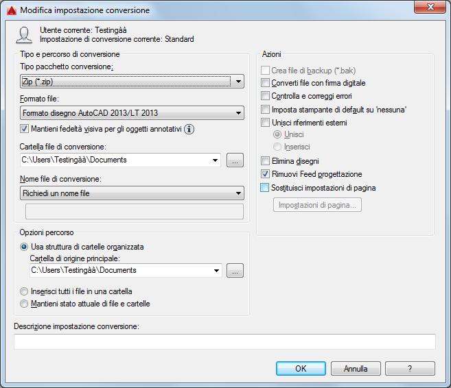 Consente di specificare il tipo di pacchetto di conversione associato all'impostazione di conversione selezionata, insieme alla posizione e alle opzioni univoche dello stesso.