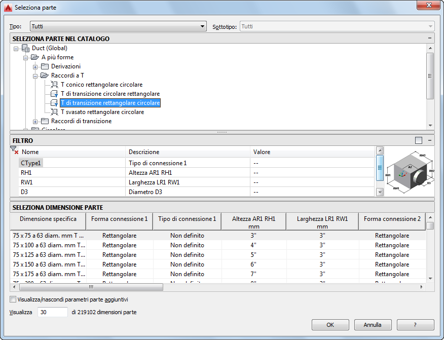 In Seleziona parte nel catalogo, la finestra di dialogo organizza i raccordi del canale aria in base al tipo di forma.