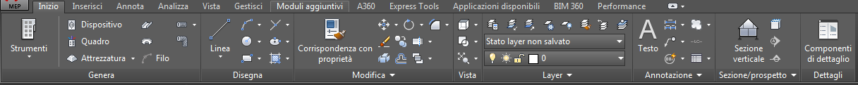 La barra multifunzione rappresenta la posizione centrale per accedere ai comandi di AutoCAD MEP. È organizzata in schede corrispondenti alle attività più frequenti del processo di disegno. Sono disponibili due tipi di schede:
