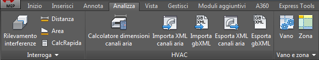- HVAC. Fornisce uno strumento di calcolo delle dimensioni del canale aria e un metodo di importazione dei dati DuctXML e gbXML.
