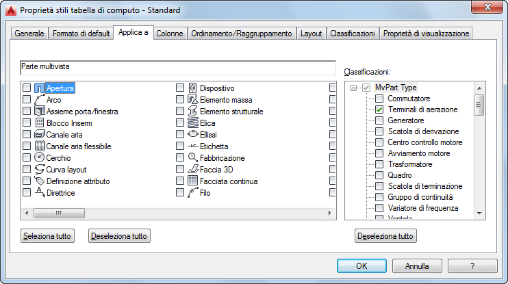 Le classificazioni consentono di ordinare oggetti mediante la creazione di uno stile classificazione, contenente valori selezionabili. Gli stili classificazione sono contenuti nello stile oggetto. È possibile utilizzare gli stili classificazione per visualizzare oggetti e inserirli nei computi. In AutoCAD MEP vengono classificati automaticamente oggetti quali le parti multivista e i raccordi. Pertanto quando si inserisce un terminale di aerazione nel disegno, il terminale viene classificato come parte multivista di tipo Terminale_aerazione. Ciò consente la creazione di un computo contenente soltanto terminali di aerazione, senza dover di includere tutte le parti multivista del disegno.